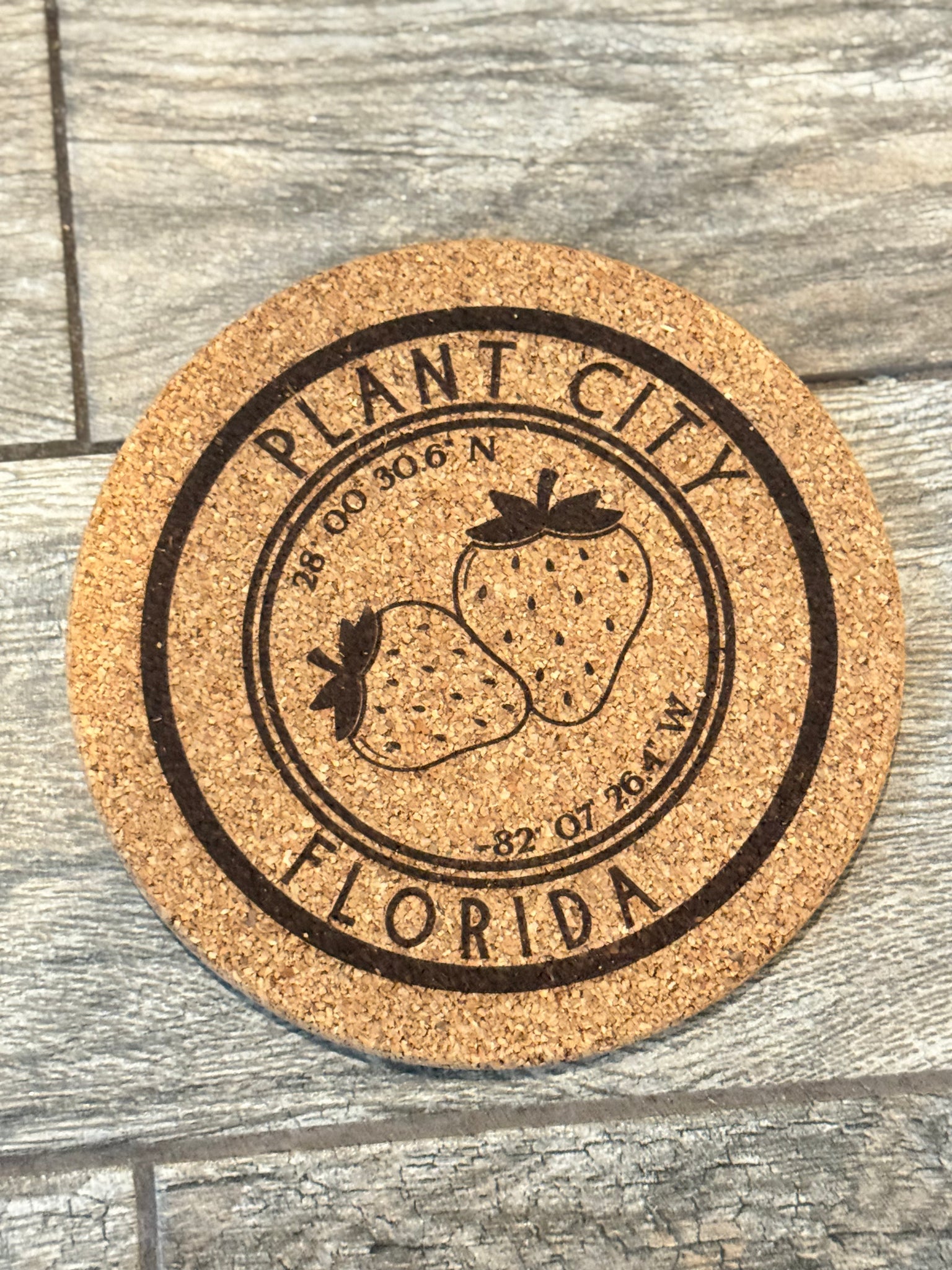 Tampa themed engraved cork trivets. 7 inches round, 0.36” thickness. Choose from 2 different designs: TPA x Teams or Tampa Skyline